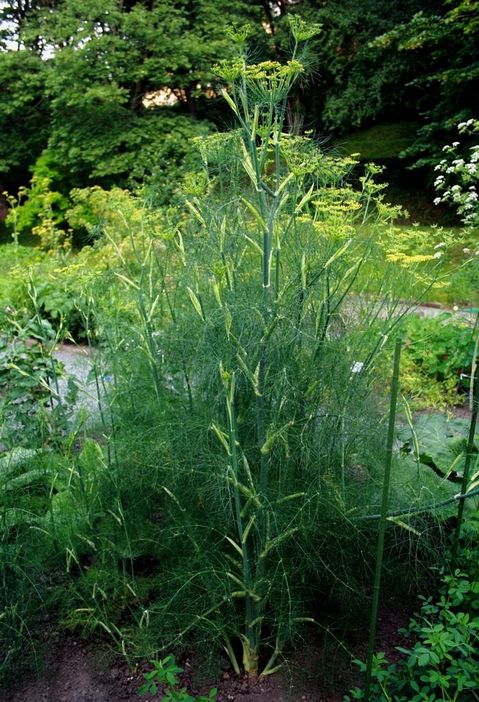 Мощные растения фенхеля с изящными, рассеченными на тонкие нитевидные доли листьями и крупными соцветиями-зонтиками с желтыми цветками могут служить центром декоративной композиции из пряных трав.