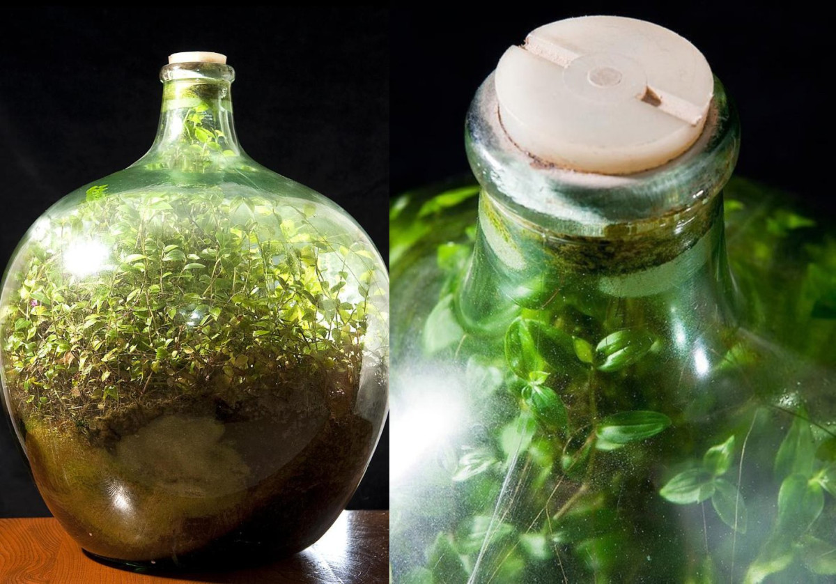 Наиболее сложным является флорариум с замкнутой экосистемой. В его закрытом пространстве растения испаряют влагу, она конденсируется на стенках сосуда, и капли конденсата затем выпадают дождем (мини круговорот воды в природе). Во время дыхания растения выделяют углекислый газ, из которого образуются в процессе фотосинтеза питательные вещества и кислород. Погибшие растения образуют гумус, прорастают новые. Наблюдать за этим чрезвычайно интересно. Это даже может стать школьным проектом по биологии для Вашего ребенка.