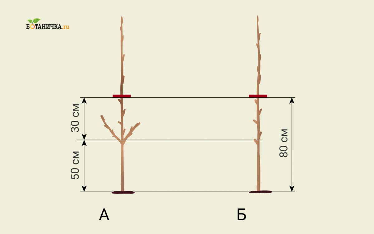 Если саженец не имеет боковых ветвей, на нем укорачивают макушку на высоте 80-100 см. Если он ниже 40 см, оставляют без обрезки.