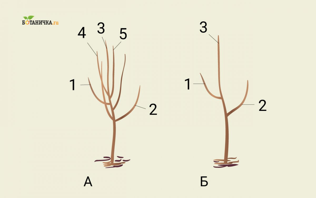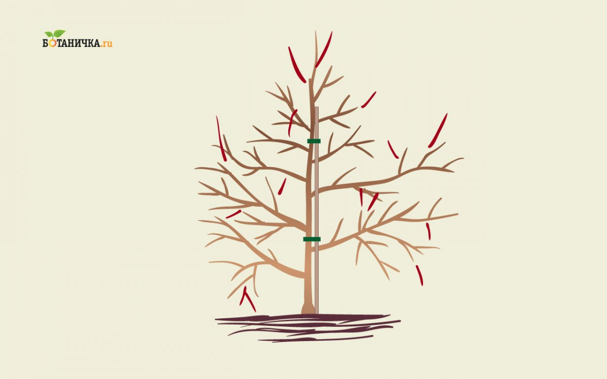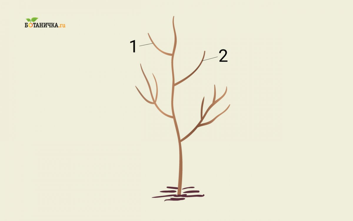 Бывает, что на саженце уже имеются боковые веточки. Тогда из них на уровне выше намеченного штамба выбирают несколько направленных в разные стороны, для образования скелетных ветвей, а все, что ниже, удаляют. Нижняя часть ствола должна быть свободна от веток, которые будут мешать сбору урожая, обработке земли вокруг дерева.