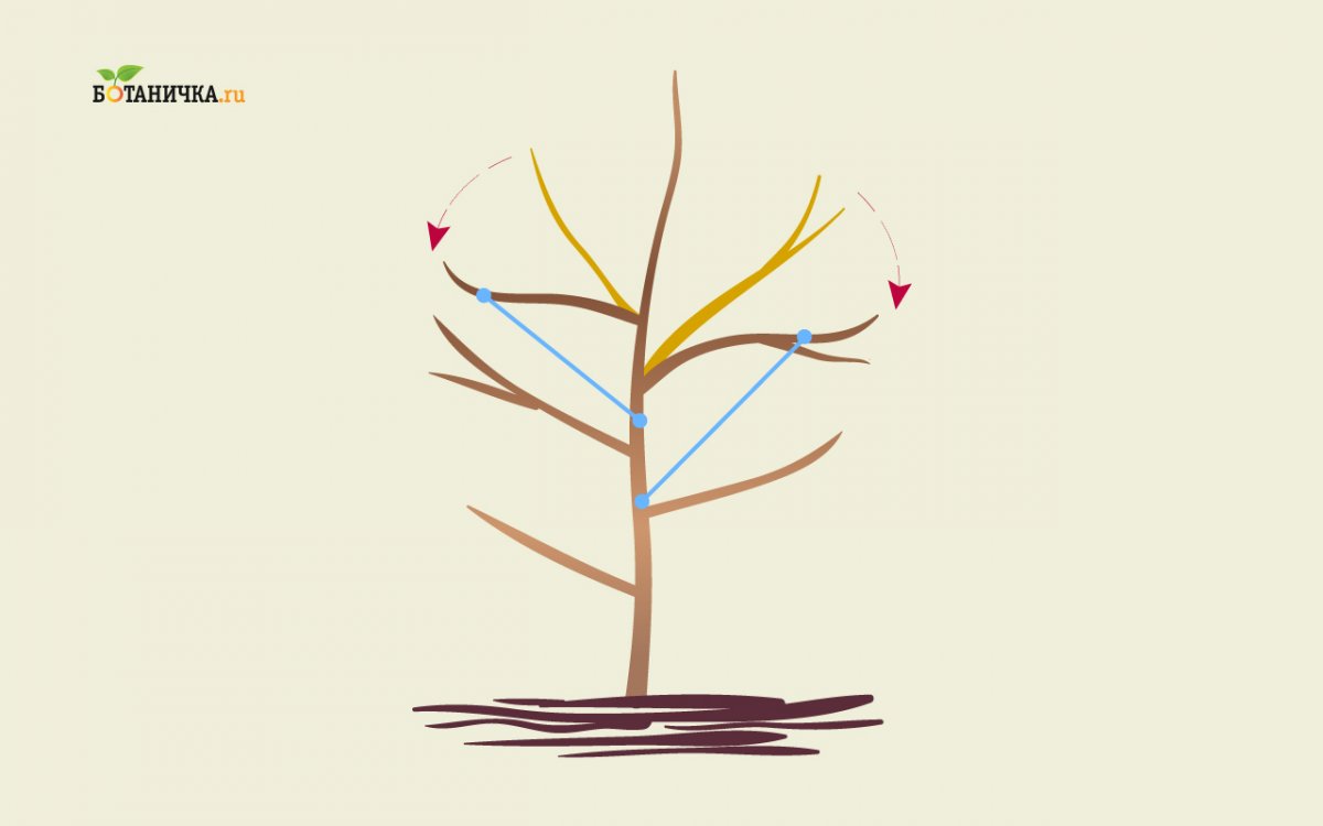Важно! Каркасные ветки соседних ярусов не должны быть расположены друг над другом. Чем больший угол со стволом составляет ветка, тем она лучше плодоносит и тем выносливее к весу плодов.