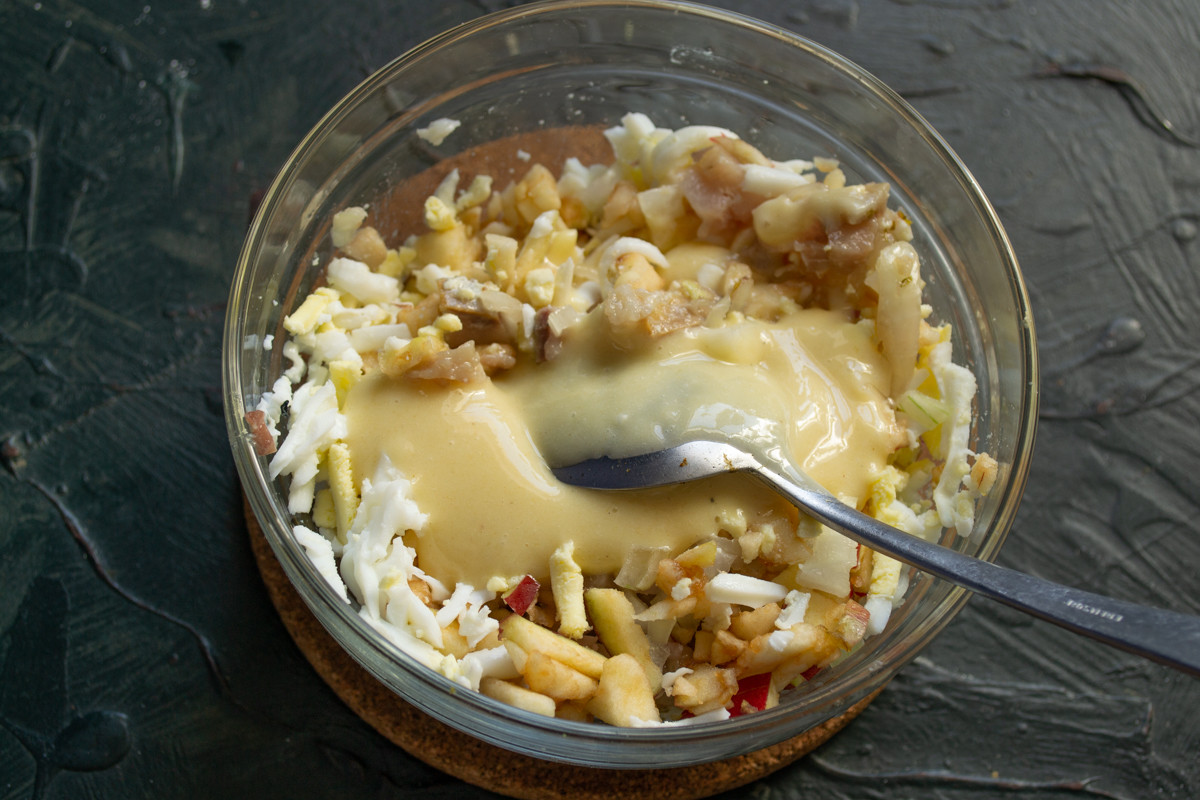 Сваренные вкрутую куриные яйца натираем на крупной тёрке или рубим ножом, мне больше нравится тёрка, — тёртый желток и белок как бы объединяют остальные продукты, не дают им рассыпаться. На этом можно было бы и ограничиться, приправив форшмак душистым растительным маслом, но с домашним соусом будет лучше, уж вы мне поверьте.