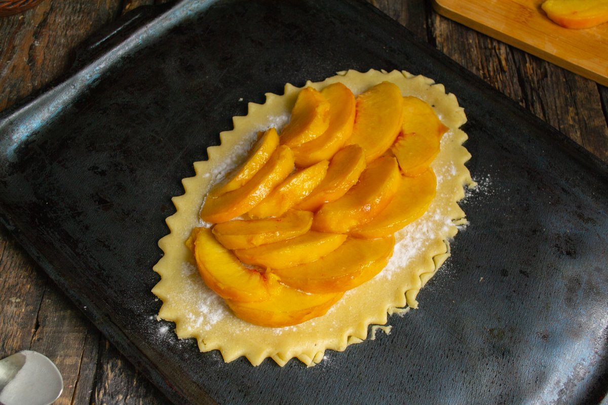 Галета с персиками из нежного, рассыпчатого, тающего во рту теста готовится достаточно быстро. Этот простой пирог из песочного теста с фруктовой начинкой понравится и взрослым, и детям. Если персики кислые, то количество сахара в начинке и тесте можно менять, полагайтесь на свой вкус. В тесто можно добавить дополнительно ещё 20 г сахарного песка, а в начинку ещё несколько чайных ложек коричневого сахара.
