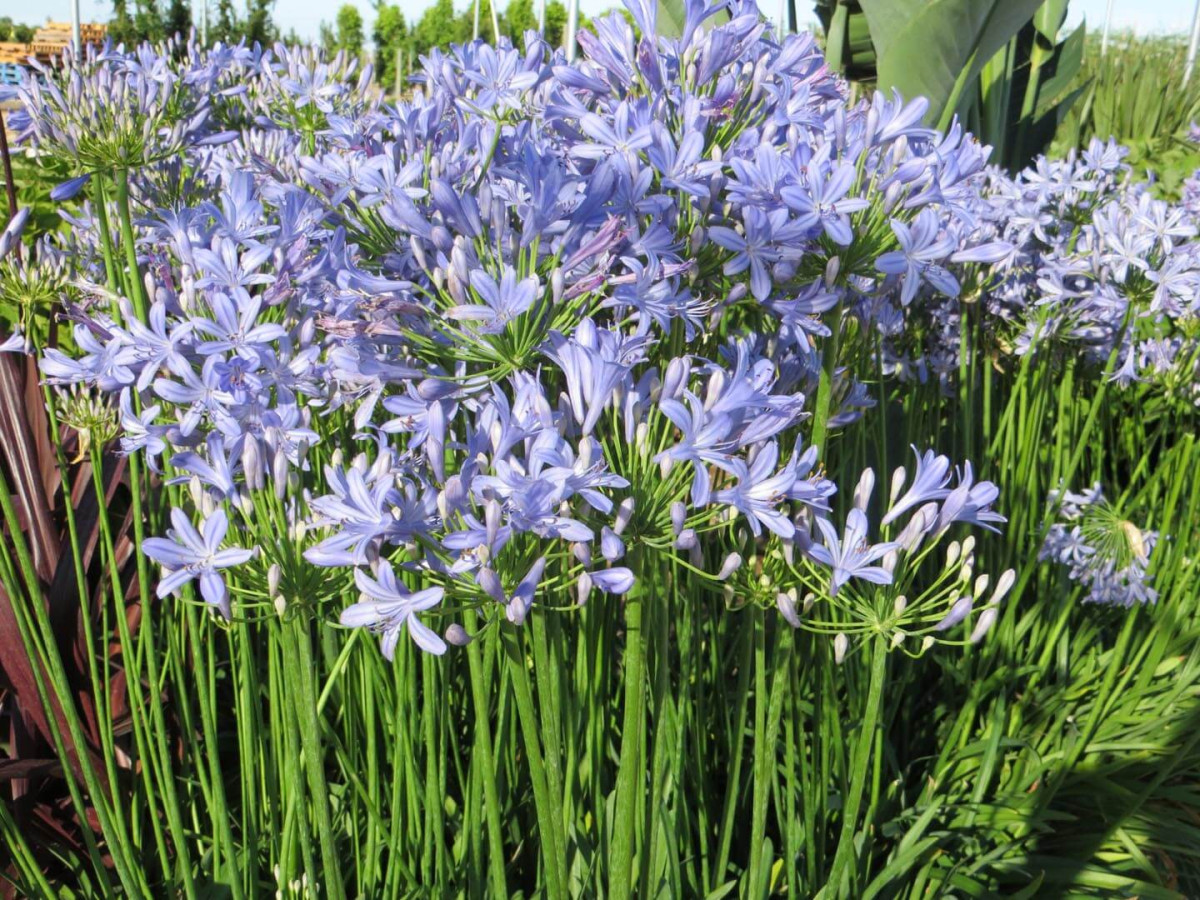 В зависимости от сорта и вида агапантусы достигают в высоту от 30 до 150 см. Узкие мечевидные листья собраны в прикорневую розетку, над которой возвышаются прочные цветоносы. В «природных» условиях бывают вечнозелеными или листопадными. В цветении, которое начинается в июле и длится до заморозков, агапантус, особенно издали, больше всего напоминает декоративный лук. Почти шарообразные соцветия-зонтики окрашены в белый, небесно-голубой, светло-лиловый или фиолетовый цвета. Встречаются цветки с контрастной полосой. Это идеальный вариант для использования в контейнерной культуре, в качестве солитера, а также для необычных цветников, например в стиле хай-тек.