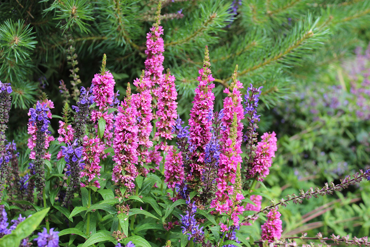 Очень эффектно в саду выглядят холодные лиловые оттенки в паре с белым, серебряным, кремовым, малиновым. Они особенно прекрасны в группе на фоне тёмно-зелёной хвои.