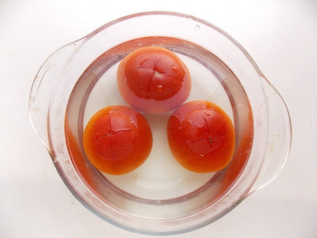 Помидоры помоем, сделаем крестообразный надрез на нижней части и зальём кипятком на 3-4 минуты. Затем осторожно сольём горячую воду и зальём томаты холодной. Теперь кожуру легко очистить.