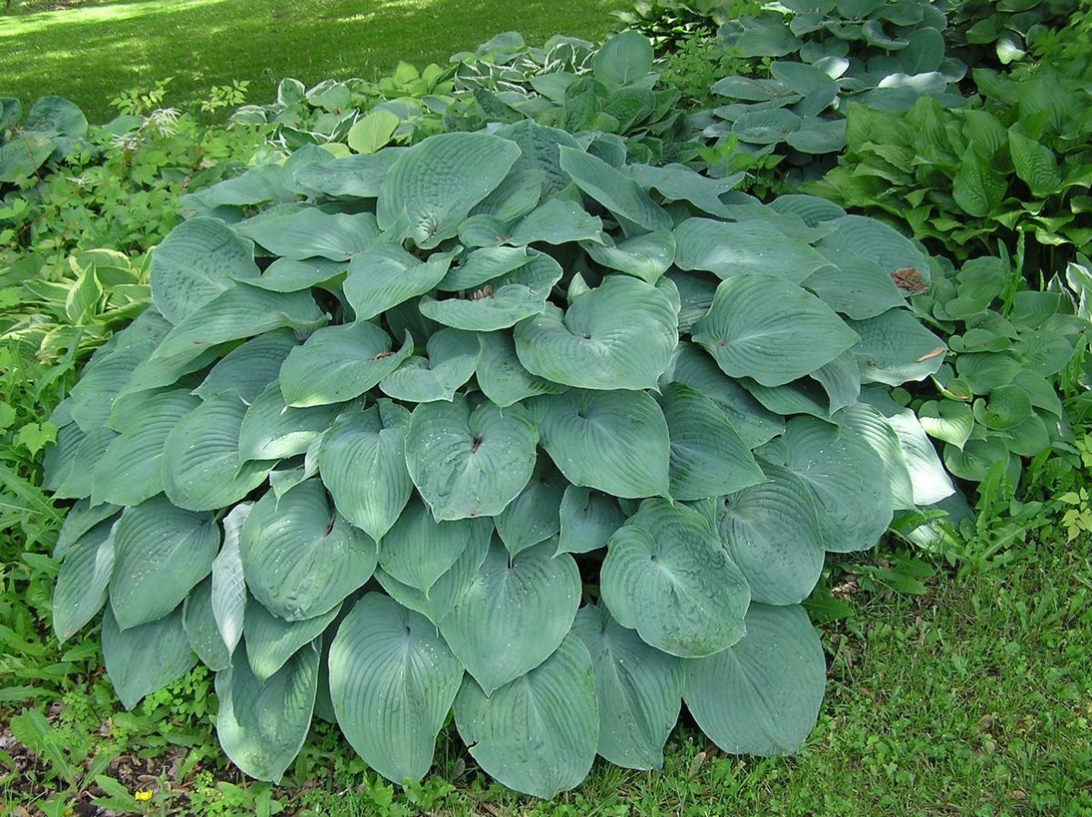 - ‘Blue Mammoth’ — голубая хоста с очень необычными симметричными, строго-жилкованными сердцевидными листьями с опущенным вниз кончиком и массивными белыми цветоносами.