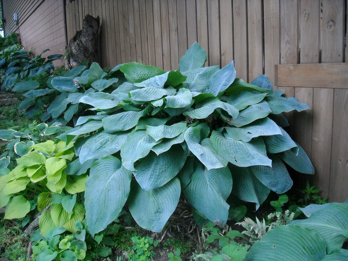 Хосты с очень крупными листьями гораздо уязвимее к прямому солнцу. Их следует размещать в укромной полутени и тени. Комфортнее всего такие хосты чувствуют себя под кронами деревьев и на северной стороне построек.