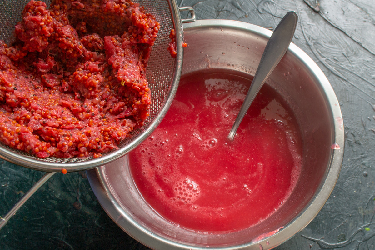 Отделяем сок от жмыха – фильтруем ягодное пюре. Ставим дуршлаг на кастрюлю, загружаем в него небольшими порциями ягодное пюре, протираем ложкой.