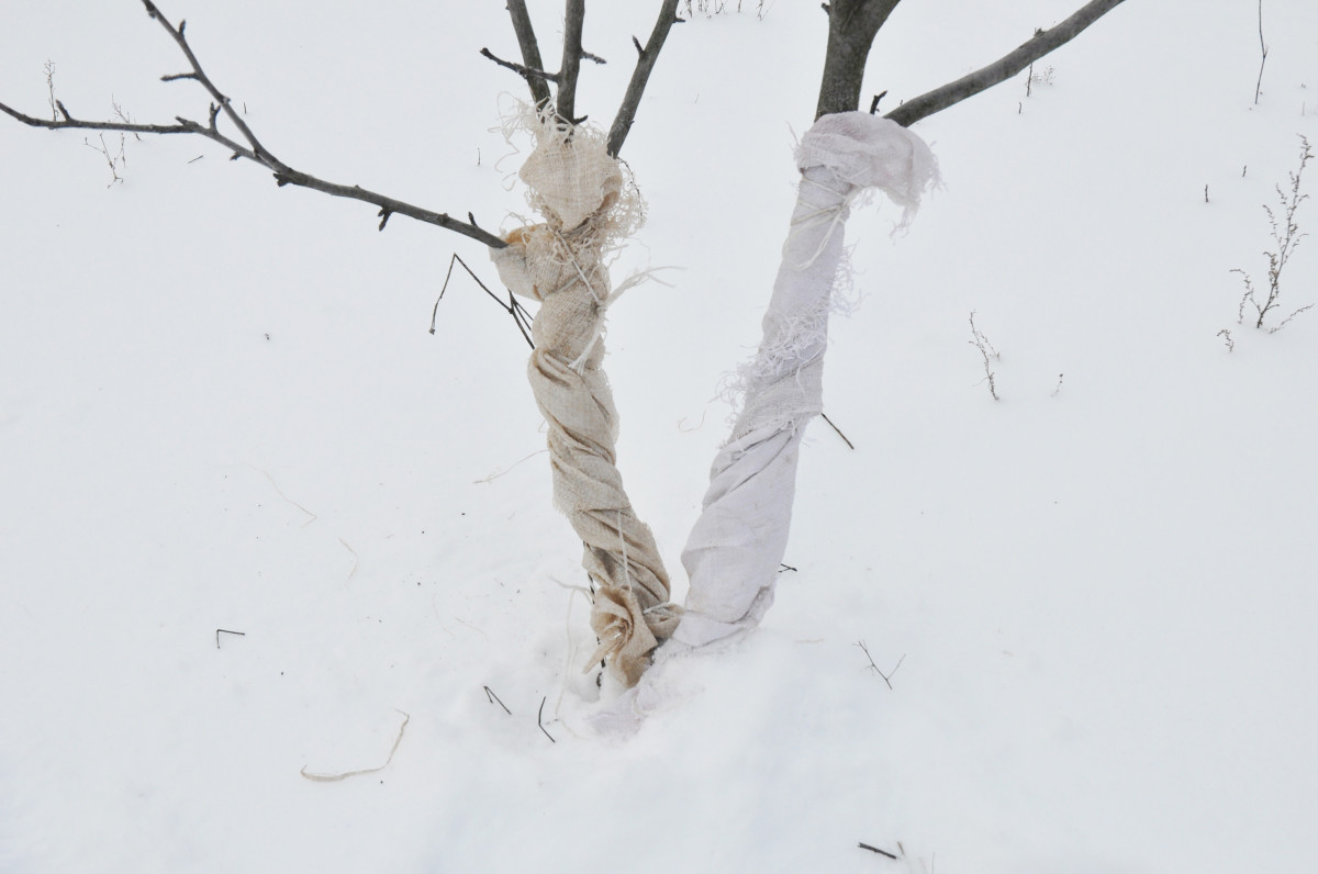 Для защиты стволиков женские капроновые колготки б/у практически лучший вариант. Зайцам и полёвкам они не по зубам, воздухо-и влагопроницаемые, дышать коре не мешают. От морозобоин вполне способны защитить. Похожими свойствами обладают и ленты из старого укрывного материала большой плотности (60 г/м2), и садовый бинт. Защищать юные деревца потребуется выше уровня снега.