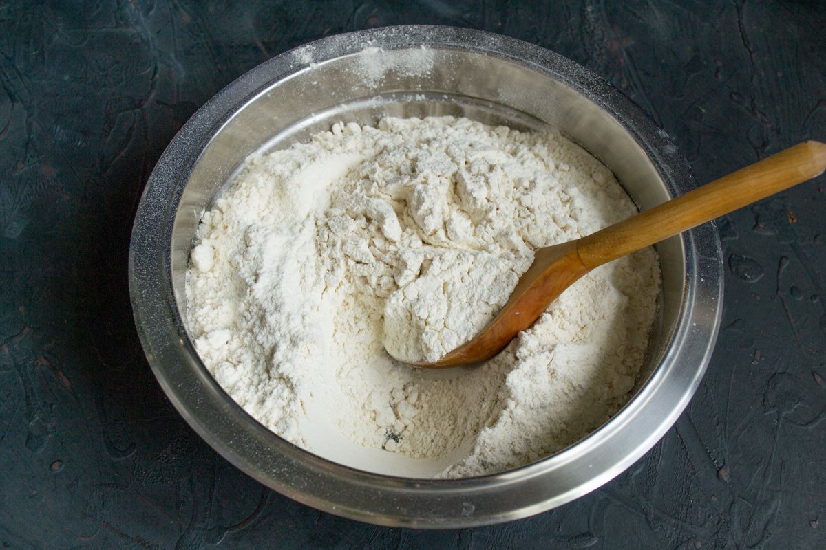 Смешиваем два вида муки, просеиваем в миску. Добавляем сухие быстродействующие дрожжи, тщательно перемешиваем. Можно использовать для этого рецепта хачапури по-имеретински только муку высшего сорта, однако в муке перового сорта больше полезных веществ, поэтому небольшая добавка только улучшит вкус.