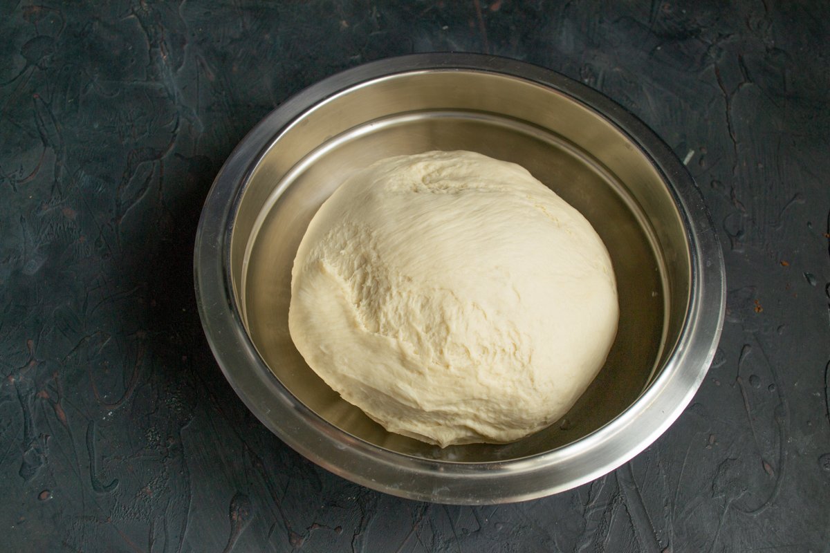 Сначала перемешиваем тесто ложкой, затем выкладываем на доску. Вымешиваем тесто 10-12 минут, пока оно не станет гладким и приятным на ощупь. Хорошо вымешанное тесто, в котором развилась клейковина, к рукам и столу не прилипает. Скатываем его в шар, кладём в миску, затягиваем пищевой плёнкой или накрываем колпаком. Оставляем на 1 час. Оптимальная температура в помещении 25 градусов Цельсия. Если в комнате прохладно или, наоборот, очень жарко, то время подъема теста нужно соответственно или увеличить, или уменьшить.
