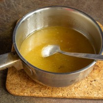 Насыпаем желатин в сотейник. Обычный желатин нужно предварительно замачивать, а быстрорастворимый — не нужно.
