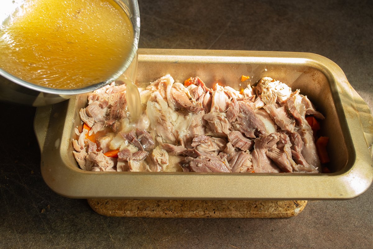 На морковь кладём оставшееся мясо, заливаем всё бульоном с вином и желатином.