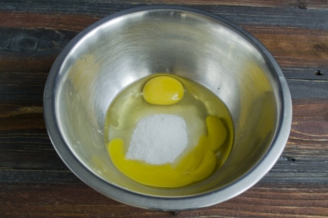В глубокой миске растираем добела сахарный песок и сырые куриные яйца. Взбивать яйца не обязательно, достаточно растереть до растворения в них сахара.