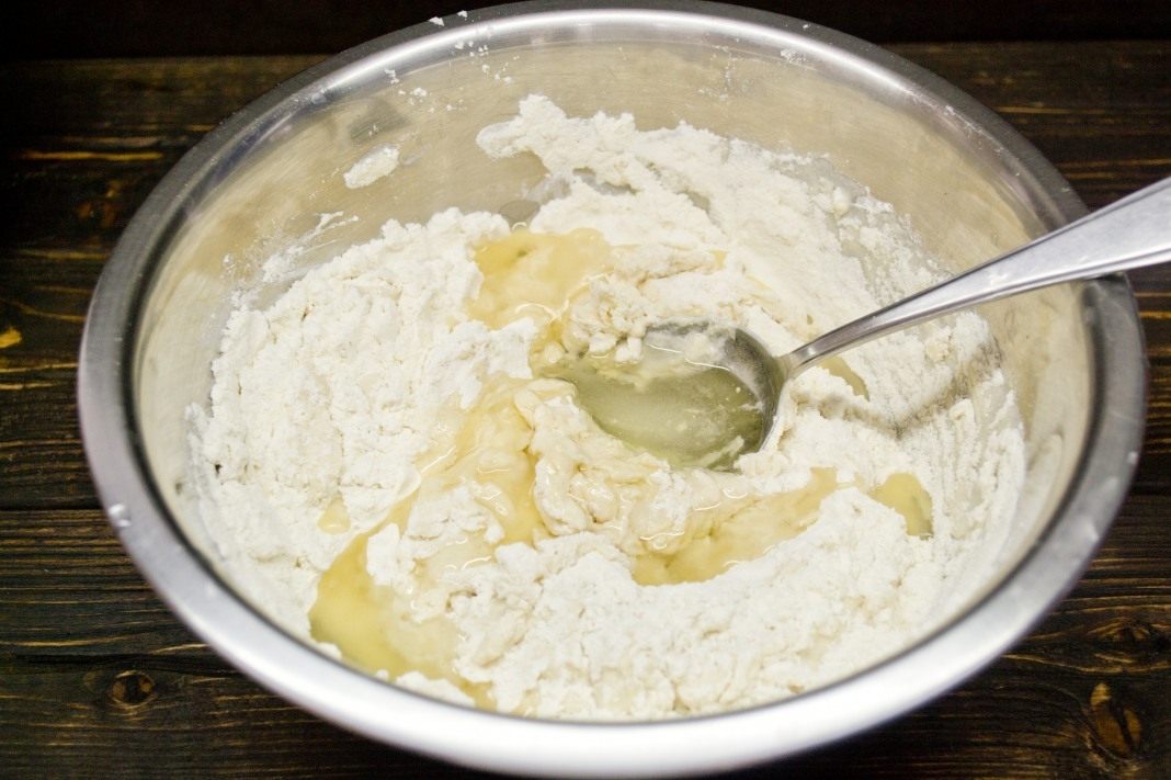 Добавляем качественное оливковое масло, замешиваем тесто сначала ложкой.