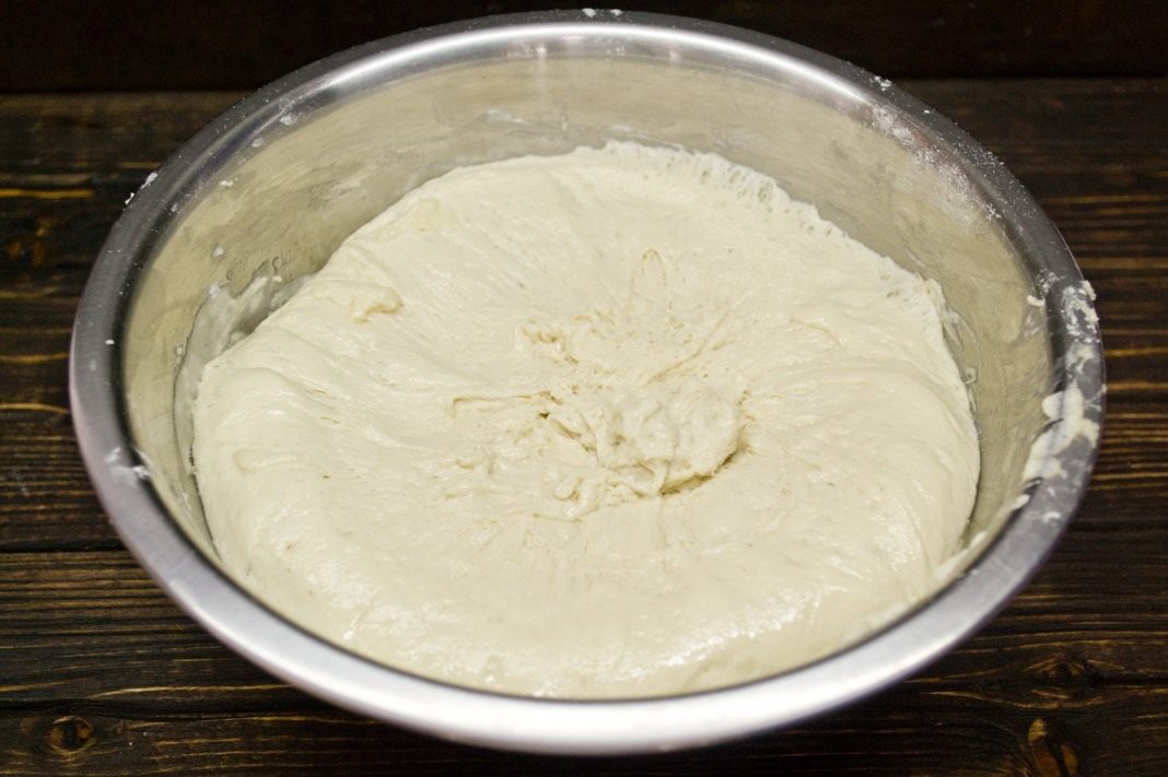 Выкладываем тесто на рабочий стол, вымешиваем руками до тех пор, пока оно не перестанет прилипать к поверхности стола. Кладём замешанное тесто в миску, смазанную оливковым маслом, оборачиваем пищевой плёнкой, убираем на 1 час в укромное место (достаточно тёплое и без сквозняков). Затем готовое тесто аккуратно обжимаем, выпуская образовавшуюся углекислоту.