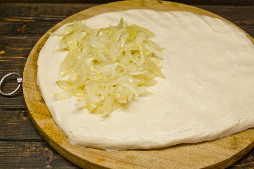 Бережно, стараясь не уничтожить полностью пузырьки воздуха в тесте, растягиваем его руками до размера формы, добавляем обжаренный и остывший репчатый лук, аккуратно вмешиваем лук в тесто.
