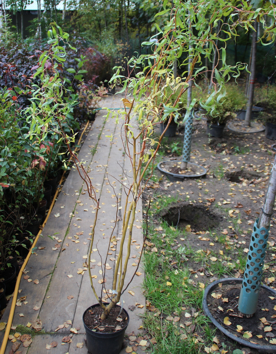 Веточки раскидистые, тонкие, изящные, в молодости очень ломкие, с неповторимыми искривлениями и изгибами, часто — спиралевидной закрученностью, за которую растение и получило прозвища извилистой и штопорной ивы. Интересная бороздчатая кора ствола серая, издалека кажется почти черной, а вот на ветках — ярко-желтовато-коричневая и гладкая, с возрастом краснеет и темнеет.