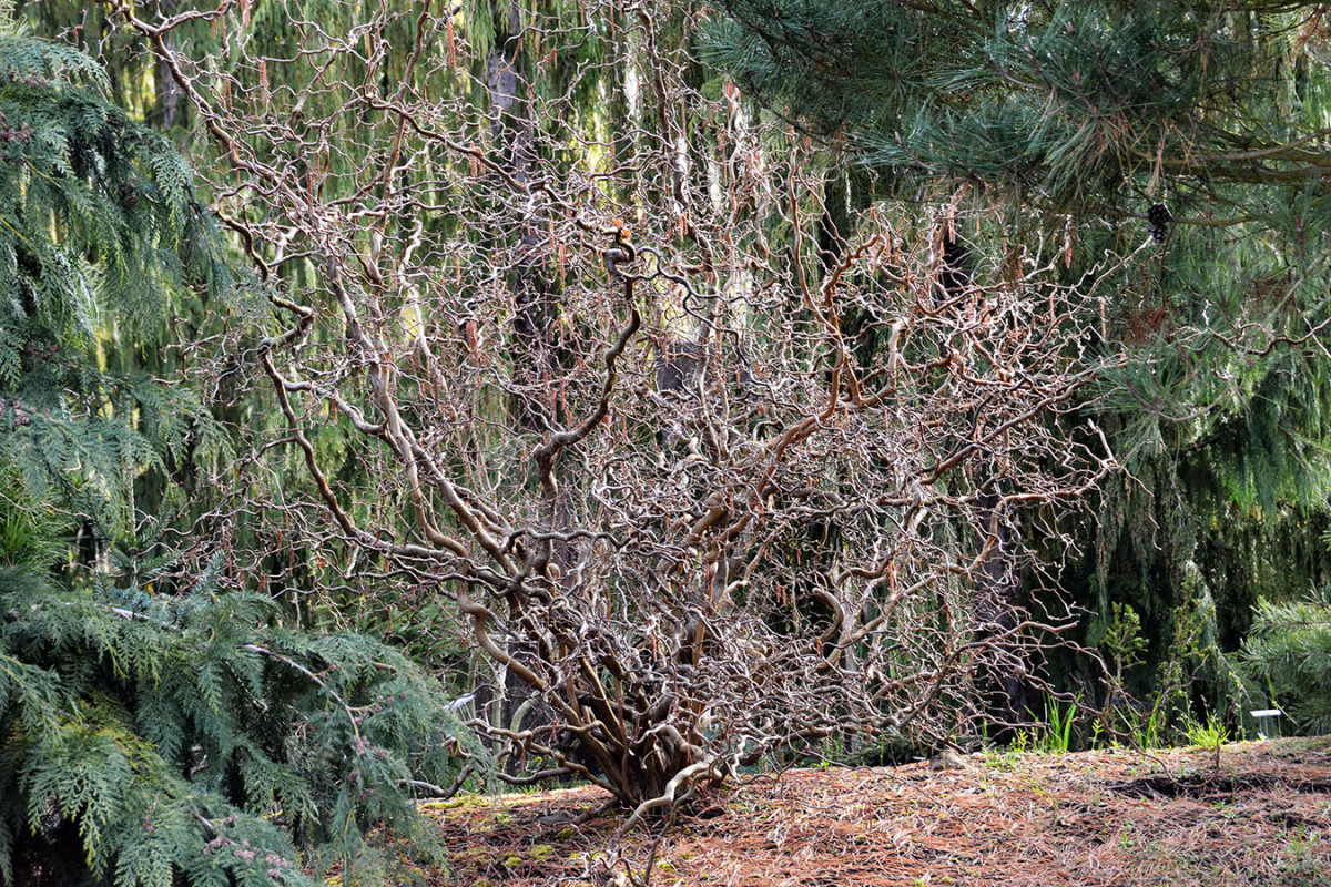 - Лещина обыкновенная «Конторта» (Corylus avellana ’Contorta’), «Ред Маджестик» (Corylus avellana ’Red Majestic’) и «Твистер» (Corylus avellana ’Twister’). Кустарники примерно 3×3 м со спиралевидно изогнутыми ветвями. В условиях средней полосы могут подмерзать.