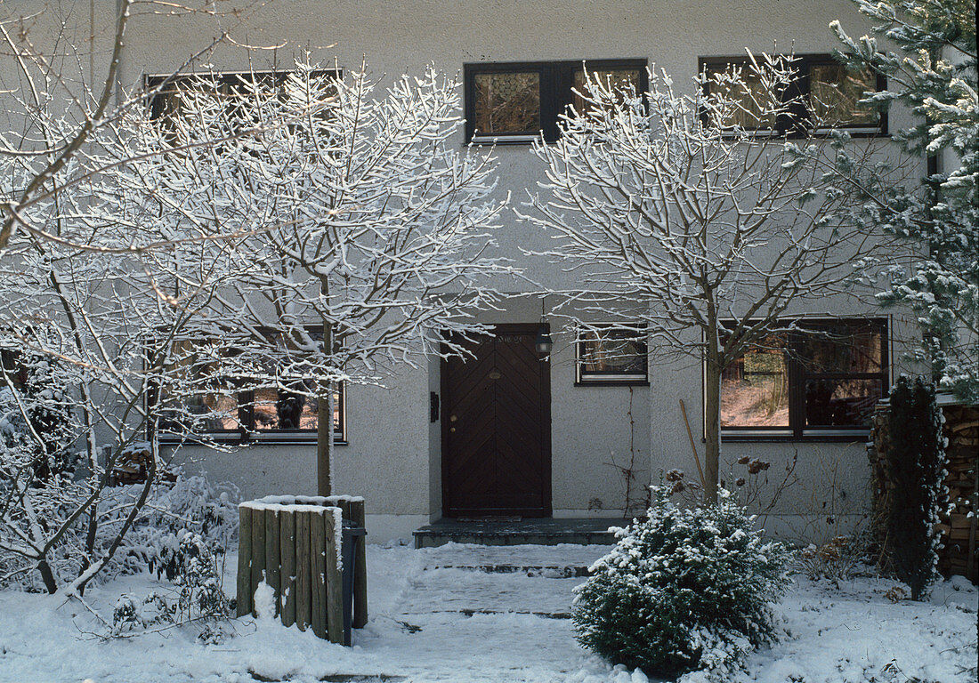 Под снегом очень эффектны растения с зонтичной кроной (например, ирга Ламарка или ива гибридная «Шаровидный карлик») и в форме ниваки. Ветви фонтанообразных кустарников (многих спирей и сортов пузыреплодника калинолистного, некоторых чубушников и др.) становятся еще изящнее, склоняясь под тяжестью снега.