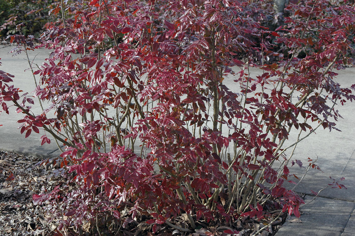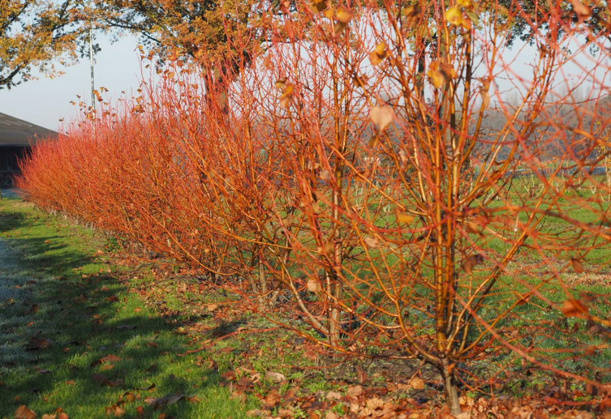 За хроматические оттенки в саду отвечают не только вечнозеленые растения. Когда лиственное убранство осыпается, в глаза сразу бросается окраска и фактура ствола и побегов. Пальму первенства в яркости коры держат дерены и ивы. У дерена белого побеги насыщенных оттенков красного, малинового и пурпурного. Дерен кроваво-красный поражает эффектным переходом от желтого к ярко-красному.