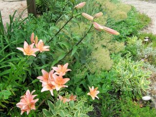- соседи должны контрастировать с лилией, подчеркивать красоту ее цветков и скрывать частично или полностью недостатки ее зелени;
