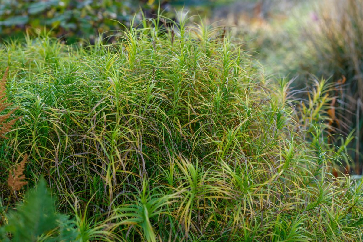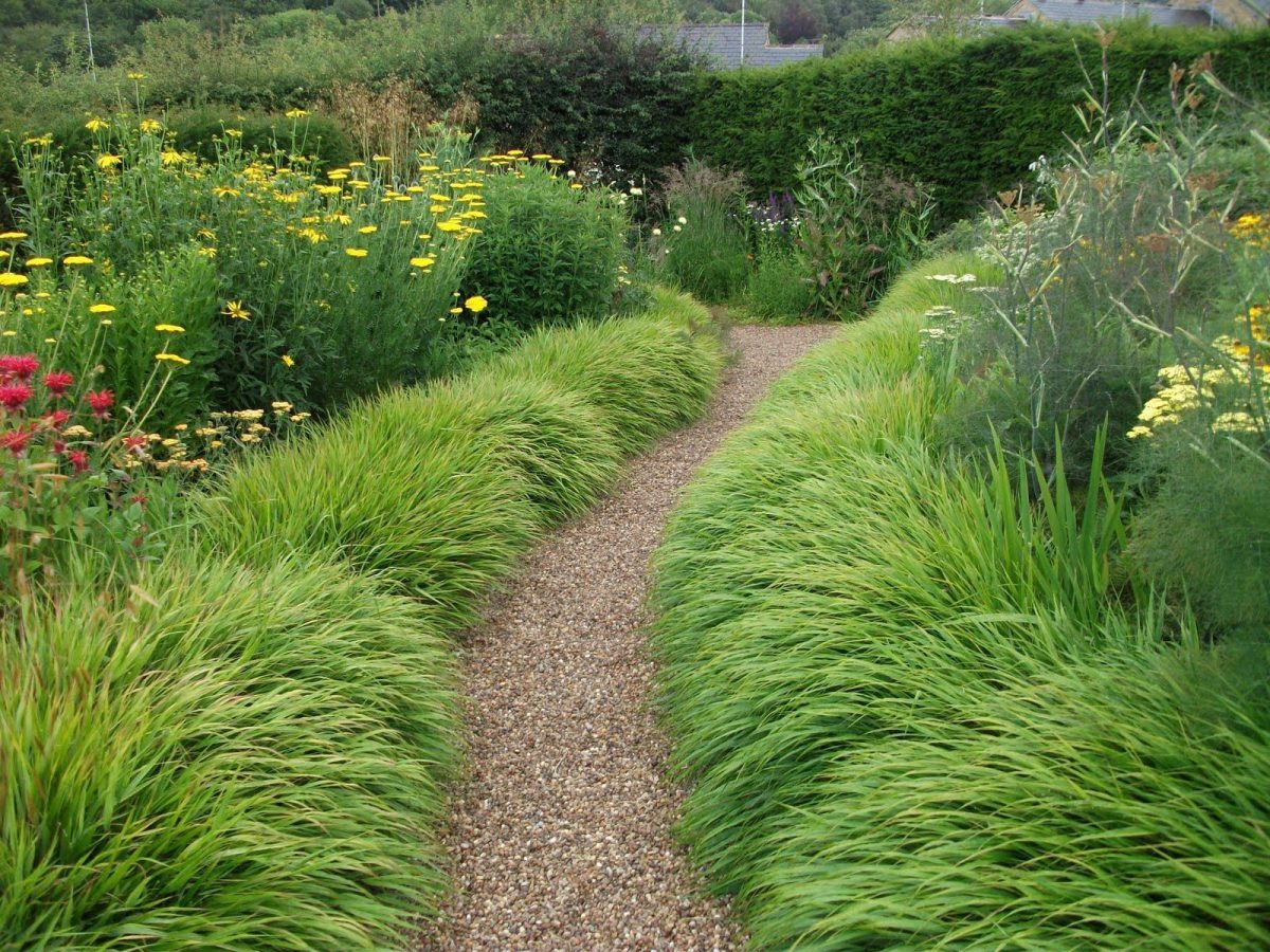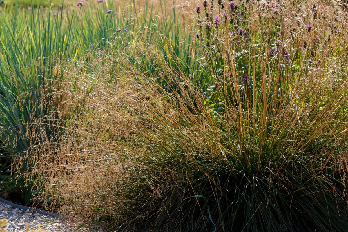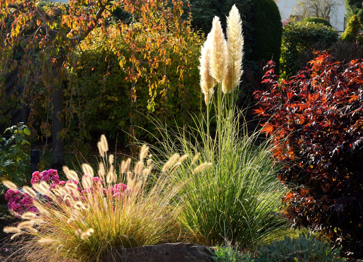 Подходящие злаки: мискантусы, щучка дернистая, лисохвост луговой, молиния голубая, двукисточник тростниковый, некоторые осоки.