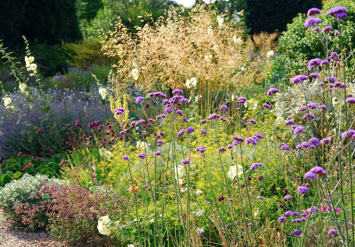 Это классический удольфианский цветник – творческая стилизация под высокотравный суходольный луг. Здесь нет ярусов и солистов, а декоративность достигается не за счет колористики и эффектности отдельных растений и соцветий, а благодаря общей структуре и графичности. Осокое значение придается осенней окраске и зимней «архитектурности» (растения не обрезают). Используется блочный или, реже, матричный способ посадки, при котором все растения располагаются большими массивами. Основа – неприхотливые и нетребовательные неагрессивные засухоустойчивые высокорослые и среднерослые (низкорослые не используются) травянистые многолетники, которые хороши «в массе своей» и имеют максимально природный облик. Ведущая роль отдана злакам: именно благодаря им создается неповторимый эффект колышущегося луга. 70% площади цветника занимает основа, 30% — дополнительный ассортимент (летники, двулетники, дикие виды луковичных). Допустимо включать в композицию регулярные элементы (например, фрагмент стриженой изгороди) и одиночные деревья и кустарники (для поддержания круглогодичной структуры в условиях снежных зим).