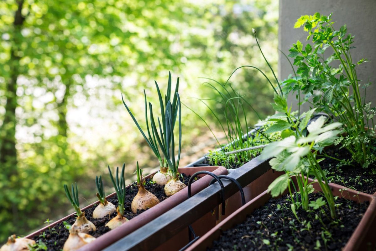 Проще всего получить зелень лука. Для этого приобретают мелкие луковички севка или самые обычные луковицы репчатого лука. Их высаживают в низкие ящики, высотой 7-10 см и регулярно (2 раза в неделю) поливают тёплой, отстоявшейся водой, следя, чтобы почва не пересыхала. Для ускорения процесса можно сначала поставить контейнеры дома на подоконнике, в тепле, и лишь потом перенести на балкон. Перо (узкие зелёные листья) начинают срезать с краёв, когда они вырастут длиной около 25 см. Лук – самая неприхотливая культура. При отсутствии грунта его можно проращивать даже в воде, поставив в банку так, чтобы вода закрывала лишь корни, иначе луковица загниёт.