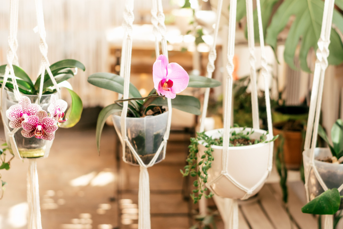 Если нет специальных кашпо с крючками, можно использовать держатели для макраме или обычные S-образные крючки. Главное — убедиться, что они выдерживают массу контейнера с землей и растением. Вязаные держатели не только эффективны, но и добавляют уюта в комнатную обстановку.