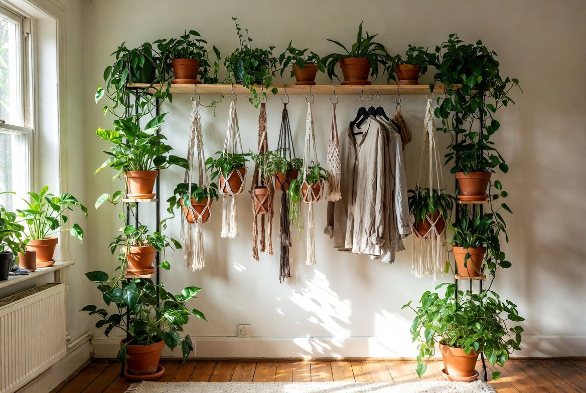 У всех разные приспособления для хранения одежды: кто вешает в шкафу, кто на штанге или напольной открытой вешалке. Последние варианты как раз подойдут для фитодизайна — главное, чтобы была открытая перекладина, за которую можно зацепить подвесные горшки.