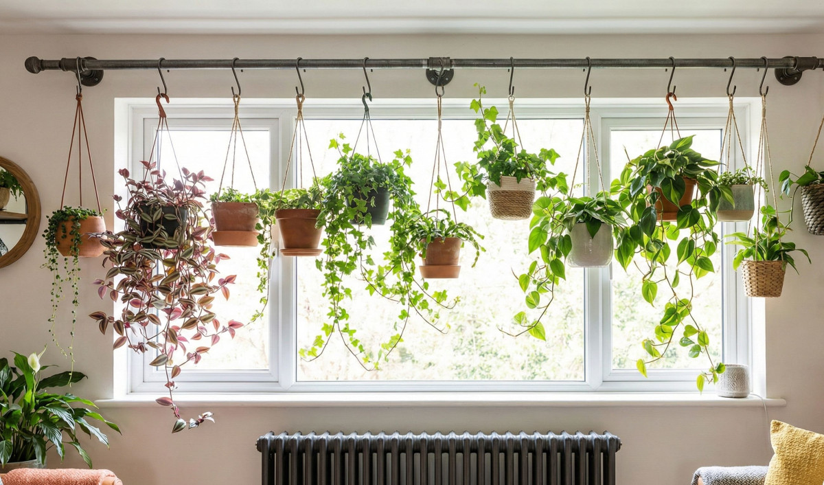 Неожиданно, но держатели и крючки можно приспособить для создания живых штор из подвесных кашпо с ампельными и вьющимися растениями. Представьте: вместо обычной ткани у окна каскадом спускаются зеленые плети традесканции, хлорофитума или плюща. Еще и близость к источнику света обеспечена.