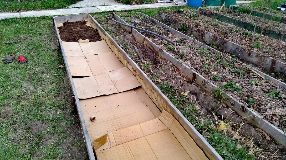 Картон будет использоваться в качестве мульчирующего материала — им закрывается поверхность почвы для того, чтобы поотмирали и переработались в гумус имеющиеся травы. Использование картона хорошо ещё и тем, что через год от него ничего не останется — почвенные микроорганизмы переработают и его тоже. Кстати, магазины выбрасывают коробки в невероятных количествах, так что найти этот материал не составит труда.