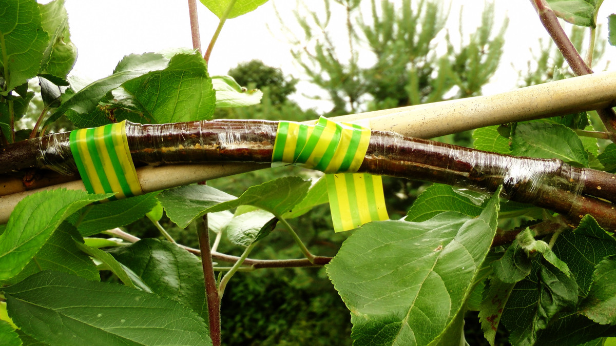 На следующий год обмотку нужно убрать, посмотреть, что получилось, если соединение кажется не особо надёжным, снова соединить, только уже лучше дышащим материалом — бинтом, например. Надолго одну обмотку оставлять нельзя — активно растущие деревца в зоне обмотки не могут нормально наращивать ширину и формируют наплывы.