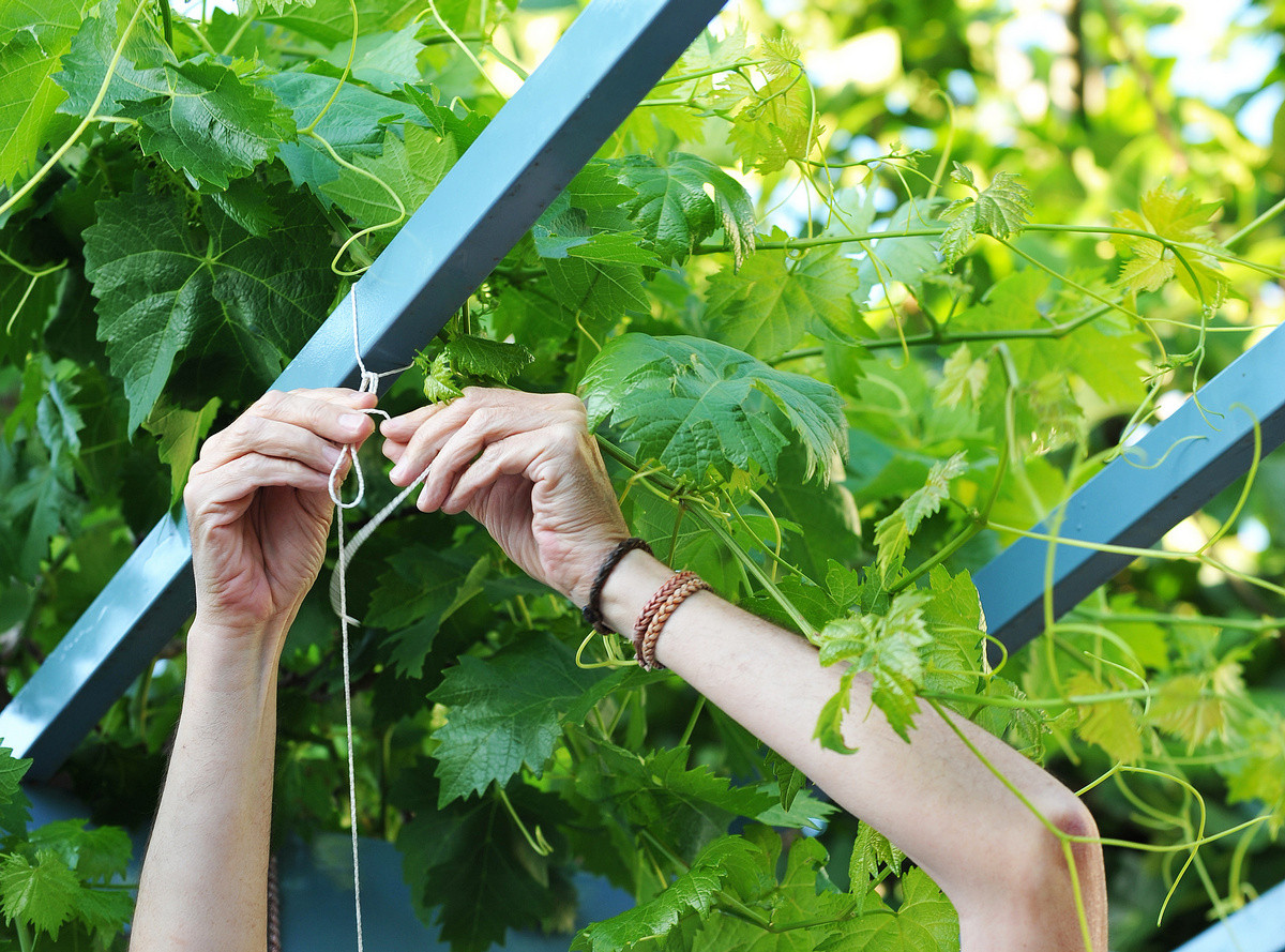 Подвязывают виноград, отступая от верхушки побега на несколько листов, мягкой бечевкой, тонкой полоской ткани, другими материалами — бережно, не пережимая, аккуратно. В зависимости от того, какую шпалеру используют — одно- или двустороннюю, декоративную — меняется и способ подвязки. Главное — не запускать этот процесс и ориентироваться на рост лозы.
