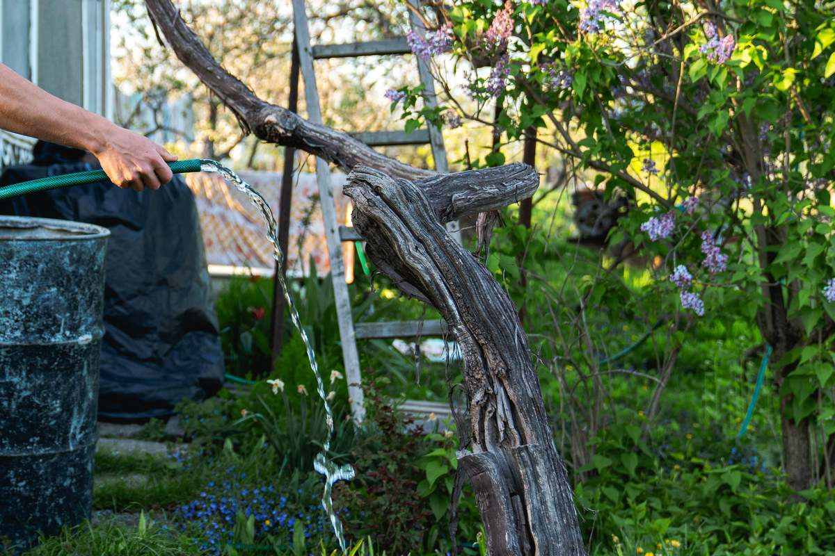 Виноград не терпит сырости и заливания, но отсутствие необходимости поливать растение часто не должно вводить в заблуждение. Поливы до и после цветения столь же важны, как и полив во время распускания почек. Поскольку начало цветения у сортов неравномерное, иногда оно затягивается до первой декады июня, за растениями нужно следить. Во время самого цветения полив запрещен, его проводят только после отцветания, а потом повторяют на стадии «гороха» зеленых ягод. Поздние сорта поливают и 1-2 раза дополнительно в сильную засуху.