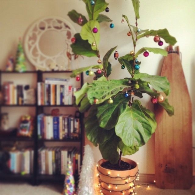 Сегодня очень модно заменять ели на различные инсталляции, имитирующие их форму — от простого нарисованного или наклеенного на стену треугольника до разных инсталляций из книг и деревянных веток. Но и комнатные растения вполне справятся с ролью альтернативы классическому новогоднему и рождественскому дереву.