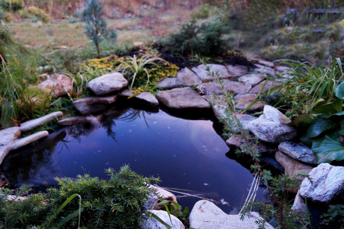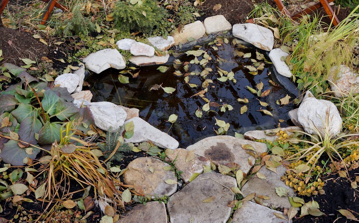 Чтобы этого не произошло, осенью натяните над прудом сетку с мелкими ячейками, при этом проследив, чтобы ее края были плотно придавлены камнями со всех сторон, перекрыв доступ к воде.