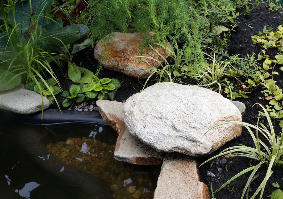 Что касается оформления береговой линией камнем, то для этих целей, чаше всего, используют породы, имеющие плоскую форму, например, сланец или плитняк. Чтобы скрыть пластиковую окантовку пруда, важно расположить камни непосредственно на нее, однако в этом случае стоять они будут неровно и неустойчиво (ввиду того что края прудика обычно возвышаются над почвой).