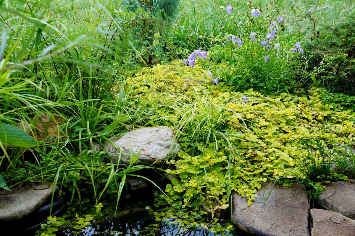 Но наиболее успешно с подобной задачей справится вербейник монетчатый. Стихия этого интересного растения — влажные места, поэтому стремительно разрастаясь, длинные стебли не только покроют береговую линию, но и живописно спустятся на поверхность воды.