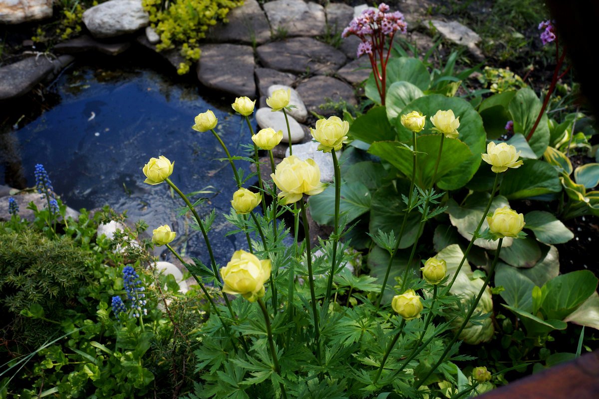 Помимо многолетников с линейными листьями гармонично будут смотреться возле пруда и такие растения: купальница, бадан, хосты, бузульники, бруннеры, астильбы и многие другие.