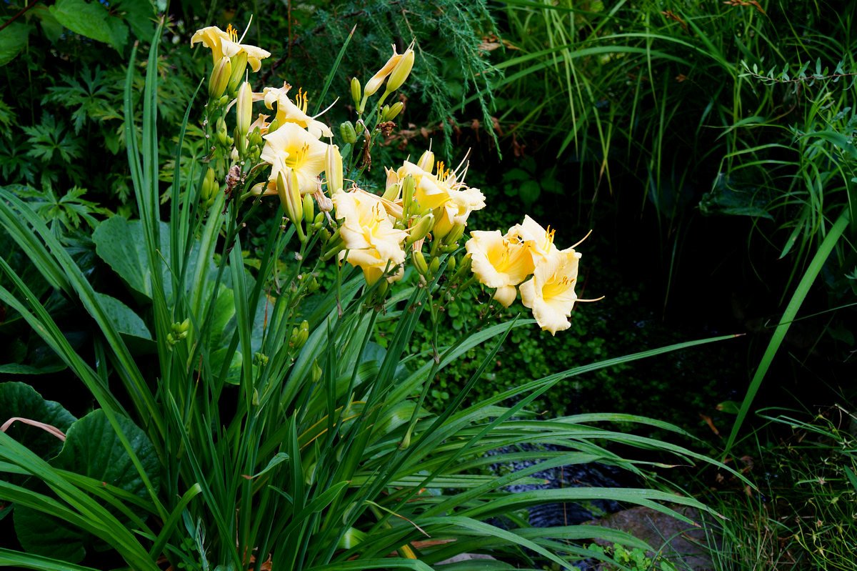 Имитировать береговую растительность можно, подобрав растения со схожим внешним видом. Например,узкие линейные листья камыша будут напоминать многочисленные злаки (осока, пеннисетум), лилейники и сибирские ирисы.