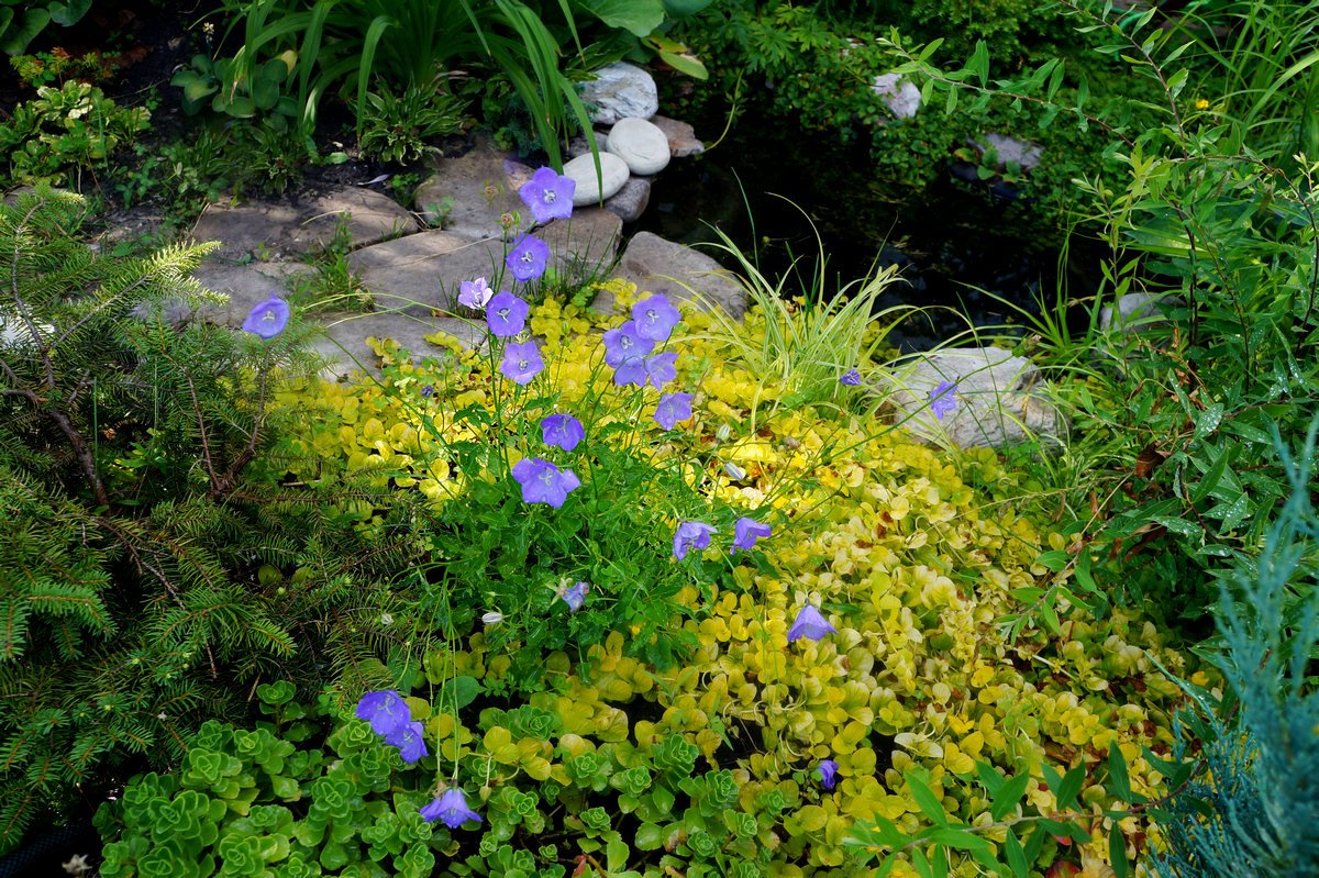 Что касается почвопокровных многолетников, призванных задекорировать пластиковую кромку чаши, то, в первую очередь, следует посмотреть в сторону стелящихся очитков (ложный, зибольда, едкий и т.д.). Плотные коврики также образуют такие растения, как флокс шиловидный, яснотка, ясколка, барвинок, и другие.