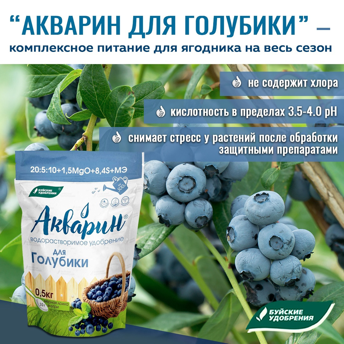 Имейте в виду, что голубику, чернику, клюкву и бруснику органикой не подкармливают. А для того чтобы обеспечить им полноценное питание, используйте водорастворимый комплекс «Акварин» для голубики, который подходит и для других ягодных культур этого семейства.