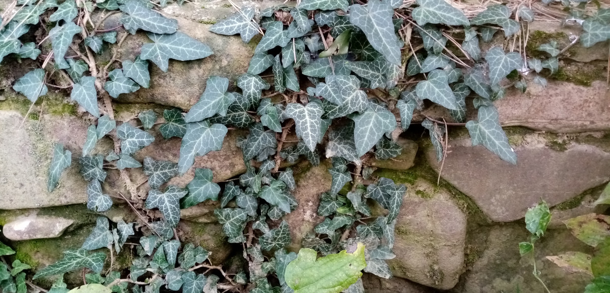 Возле дома высадили пестролистный плющ с несколько гофрированными краями рыночного происхождения. В качестве почвопокровника он необыкновенно хорош, закрыл за 5 лет пространство в 3 м2 и начал подниматься на сетку (прочную пластиковую диагональную), которая предназначена для апиоса.