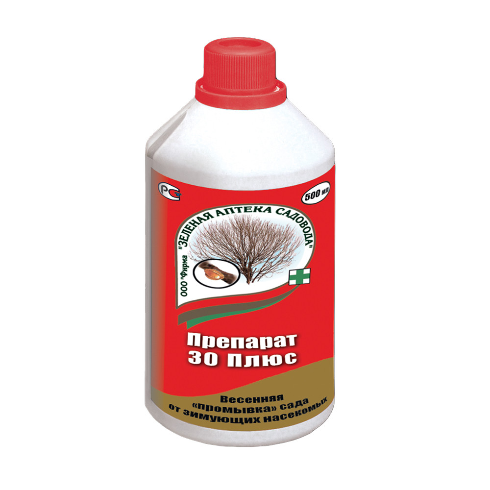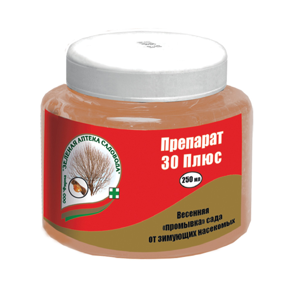 На самом деле, есть эффективное средство и для ранневесенних профилактических обработок сада. Это минерально-масляная эмульсия «Препарат 30 плюс». Вазелиновое масло, входящее в состав средства, работает и в прохладную погоду (выше +4 градусов), и обладает ярко выраженным овицидным действием, то есть позволяет уничтожать кладки яиц, и действует против широкого перечня распространённых садовых вредителей: