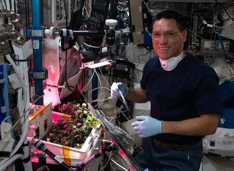 На МКС расположен экспериментальный космический сад «Veggie», где устроили компактную систему выращивания овощей и фруктов. Размером она с чемоданчик, вмещает всего 6 растений, а вместо обычного грунта в ней находится прослойка из питательного субстрата, в его основе глина и удобрения. Растения растут в условиях невесомости и используют для ориентира свет от специальных светодиодных ламп.