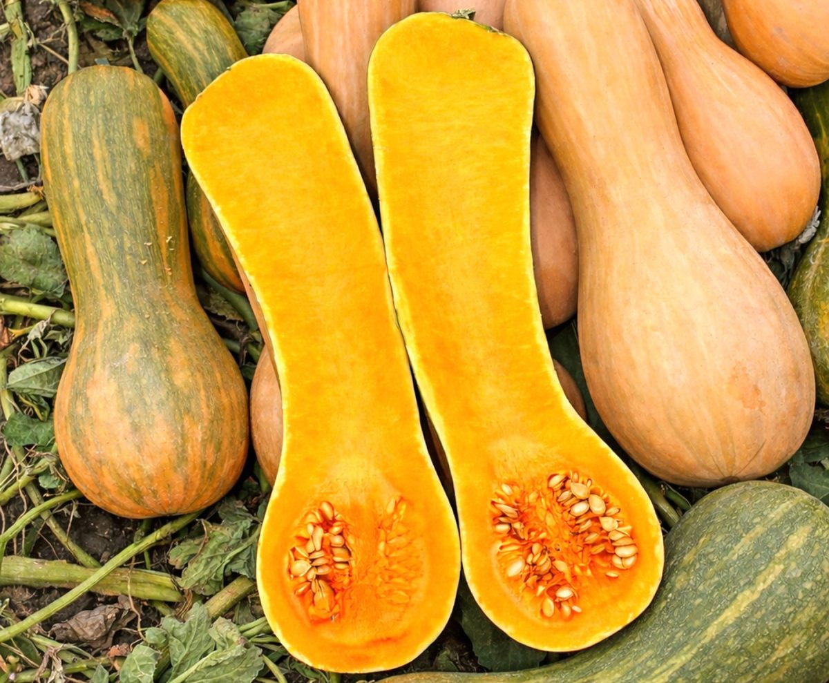 Вкус у Баттерната нежный, сладкий, с лёгким ореховым привкусом. Мякоть плотная, маслянистая, идеально подходит для крем-супов: не нужно процеживать, консистенция получается бархатистой сама по себе. После запекания становится ещё слаще. Отлично режется даже в сыром виде, что удобно для заморозки порционными кусками.
