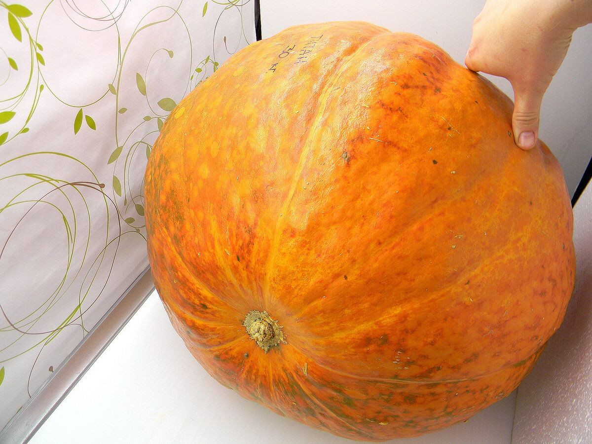 Сорт для тех, кто хочет вырастить действительно крупную тыкву без особых усилий. Растение очень мощное, плети толстые, длинные, занимают много места. Обычно на кусте оставляют 1-2 плода, чтобы они набрали максимальный вес: 20-50 килограммов и больше. Кожура толстая, оранжевая с серыми прожилками, форма округлая, слегка приплюснутая.